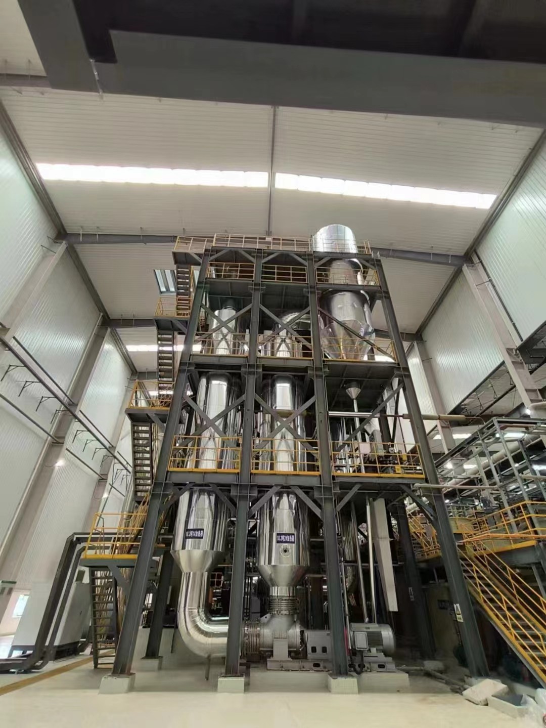 各效加熱器、各效分離器、冷凝器(混合式或表面式)、各效強(qiáng)制循環(huán)泵、冷凝水泵、真空泵、操作平臺(tái)、電器控制柜、液位自控系統(tǒng)及界內(nèi)管道閥門等組成。